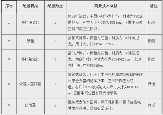 主面料采用國旗紅色,并符合《衛生應急毒物個人攜行裝備技術規范(試行)》相關規定。內部單元包采用綠色,外掛包采用灰色。
