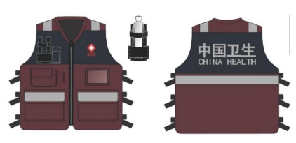 馬甲——主面料采用防水、透氣的貼膠尼龍牛津紡布料,使用銀灰色熒光條進(jìn)行橫向分割,充分保證了野外工作的要求。左胸上部標(biāo)識為“衛(wèi)生系統(tǒng)統(tǒng)一形象標(biāo)識(豎向標(biāo)準(zhǔn)組合)”圖案,背部標(biāo)識為銀色反光字(中國衛(wèi)生CHINA HEALTH)。