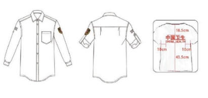 夏裝——白色襯衫和專用藍(lán)色褲子搭配設(shè)計(jì),襯衫袖內(nèi)設(shè)寶劍袢,可挽起做短袖使用。圓領(lǐng)衫采用棉質(zhì)材料,背部中上方標(biāo)識為(中國衛(wèi)生CHINA HEALTH)。