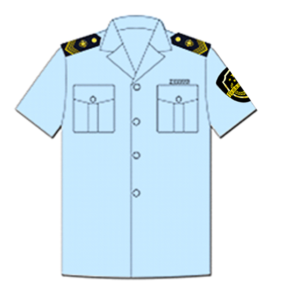 說明:襯衫為滌棉混紡面料,顏色為深藍色,短袖襯衫為小翻領,單排四粒扣,兩個明口袋。長袖襯衫為豎領,單排五粒扣,兩個明口袋;西服簡褲或裙子為毛滌混紡面料。