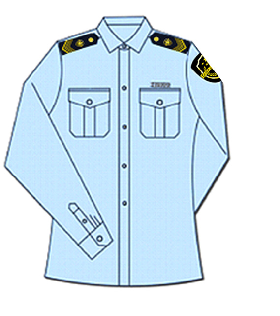 說明:襯衫為滌棉混紡面料,顏色為深藍色,短袖襯衫為小翻領,單排四粒扣,兩個明口袋。長袖襯衫為豎領,單排五粒扣,兩個明口袋;西服簡褲或裙子為毛滌混紡面料。
