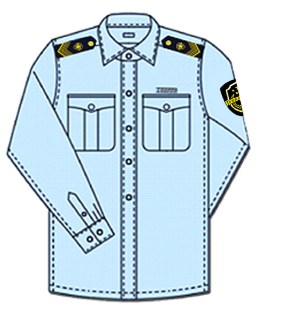 說明:襯衫為滌棉混紡面料,顏色為深藍色,短袖襯衫為小翻領,單排四粒扣,兩個明口袋。長袖襯衫為豎領,單排五粒扣,兩個明口袋;西服簡褲或裙子為毛滌混紡面料。